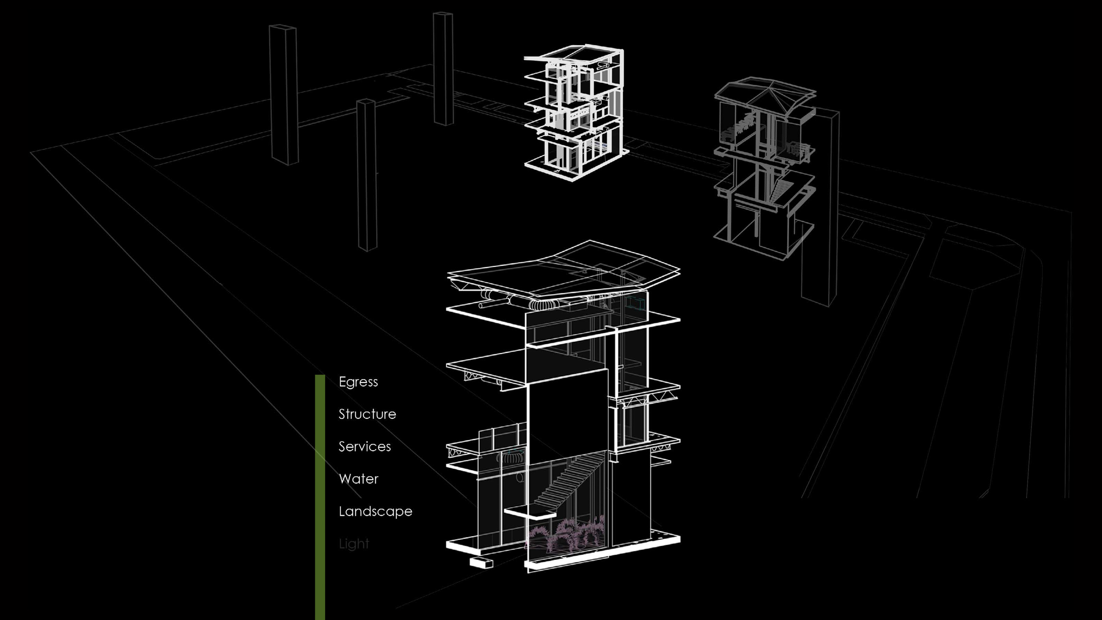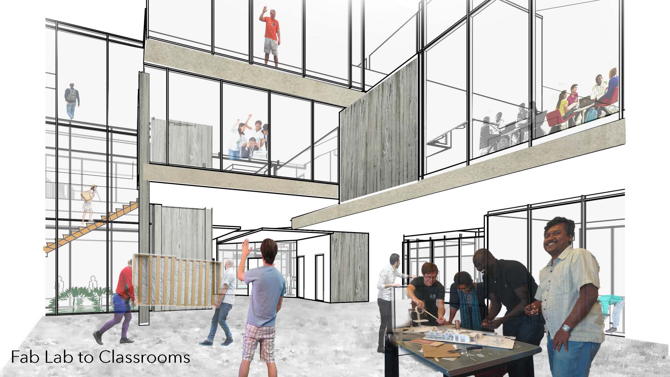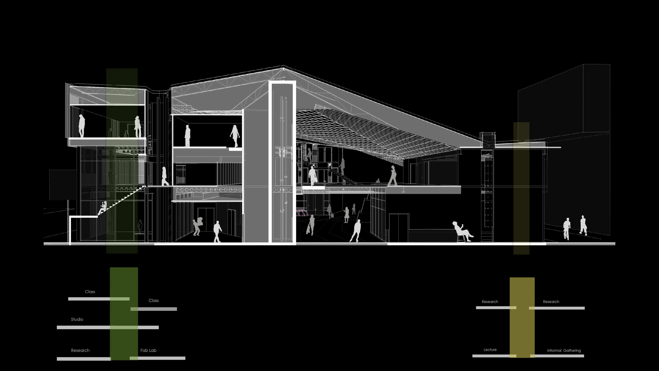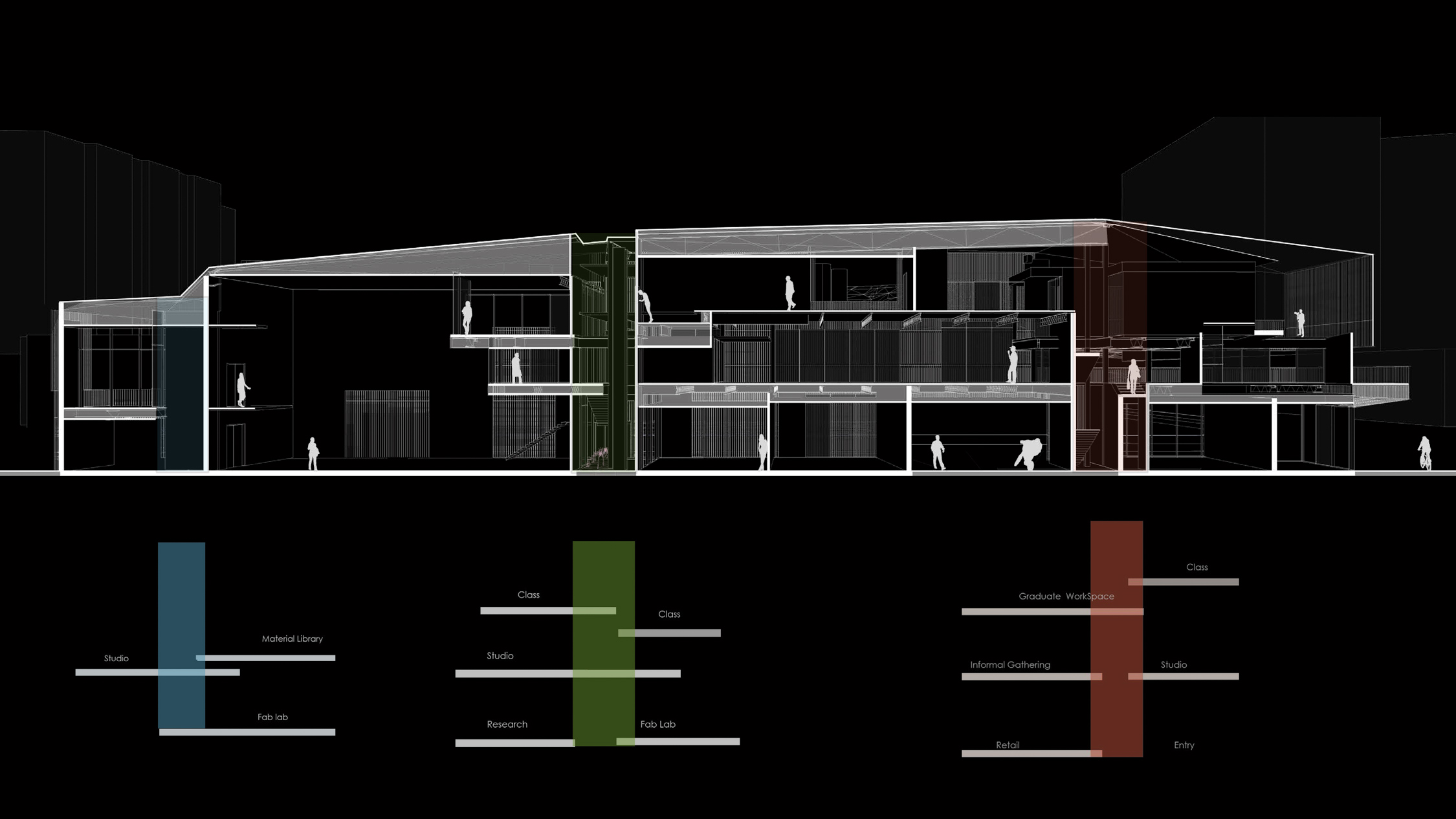 This project has three levels comprised of platforms with 30" offsets to allow programmatic mixing.