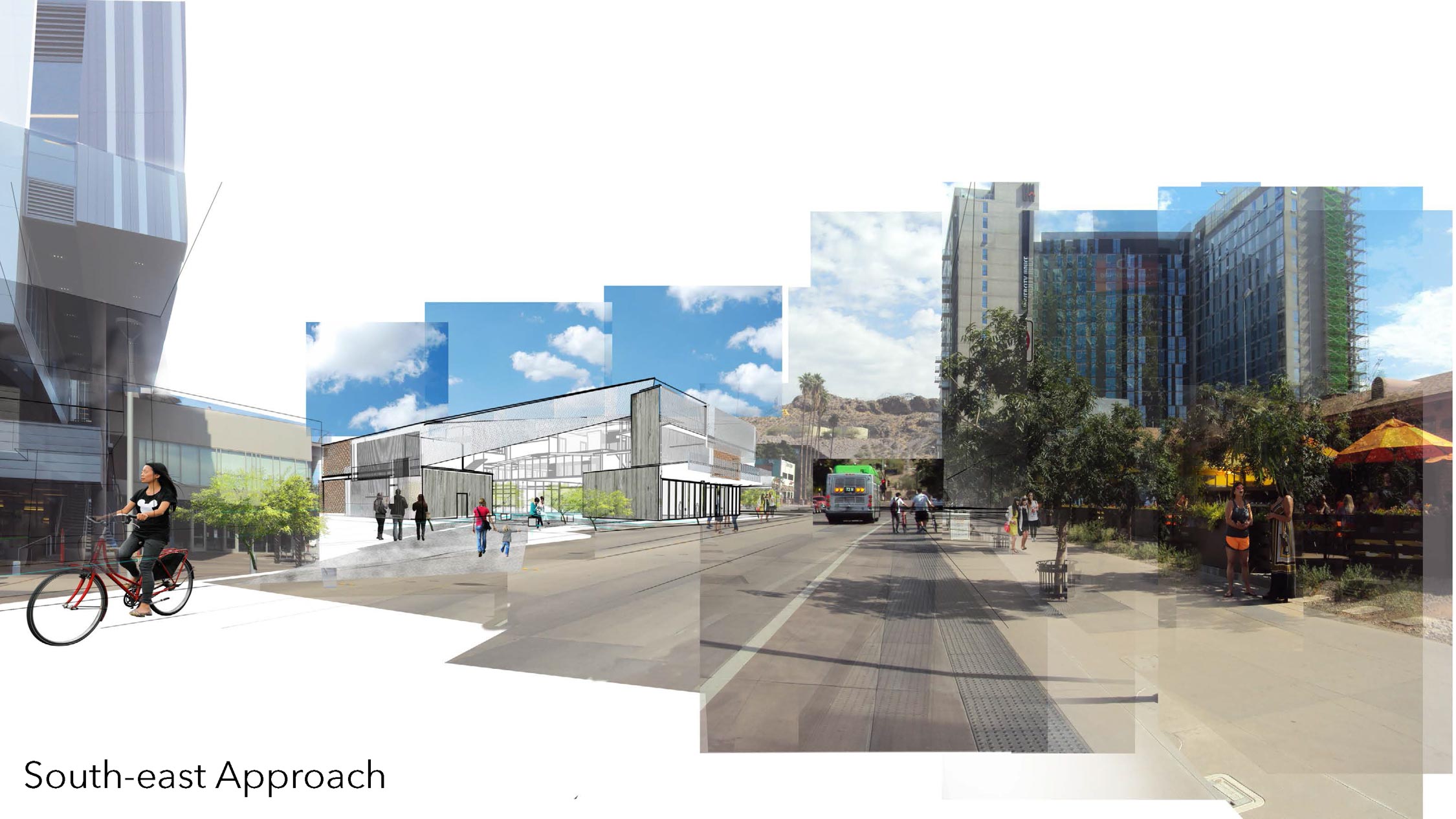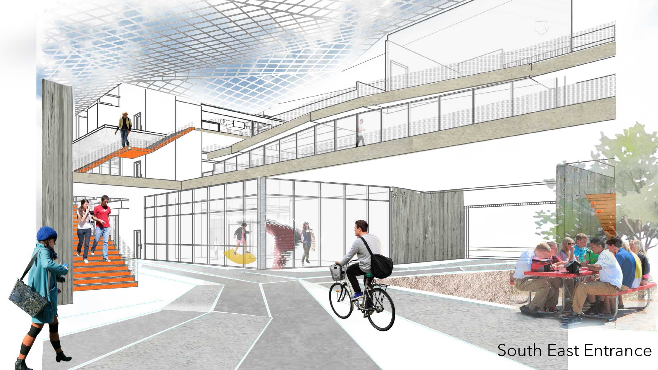 An open ground plan provides a shady respite to pedestrians walking from campus to the light rail.