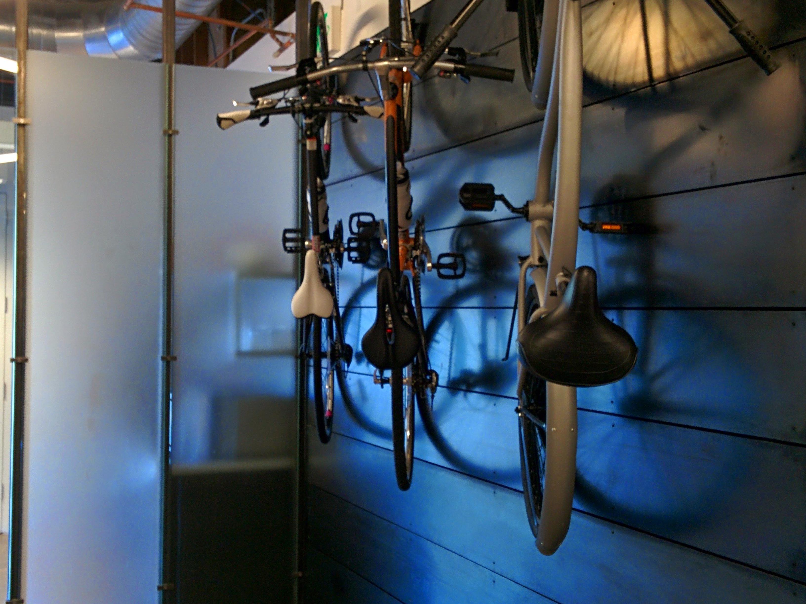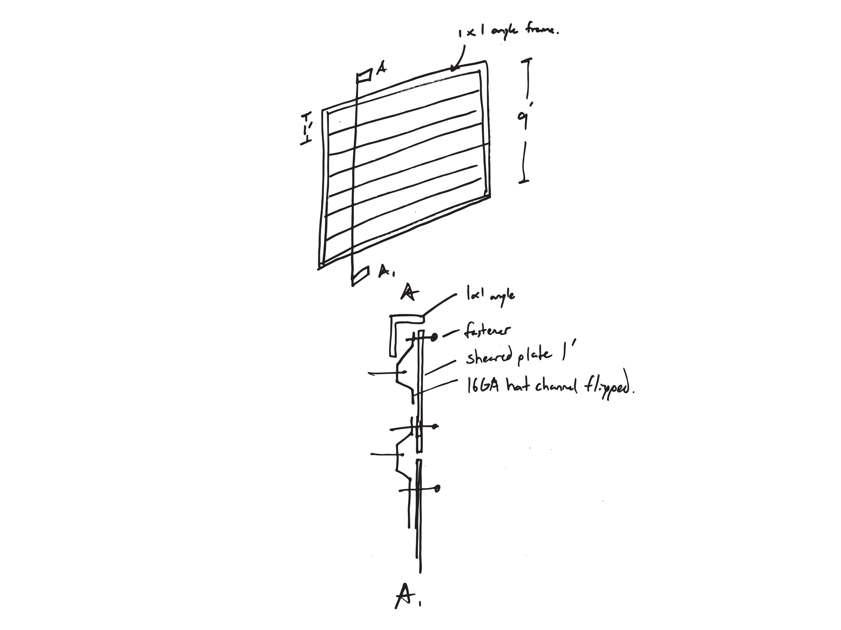 At our office we recently bought bicycles that everyone can use to ride to the gym or go to lunch. I quickly detailed the wall with one of our welding subcontractors. We wanted to give the sheared plate a shadowline reveal and I had the idea to use standard hat channel but reverse it as the supporting structure.
